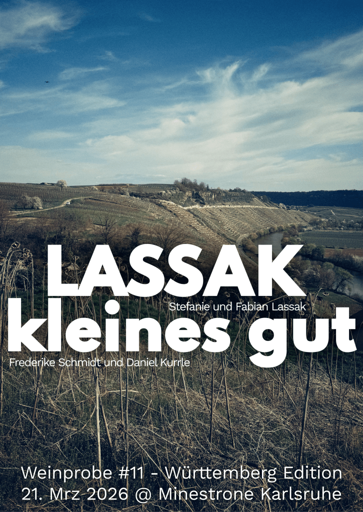 Am 21.03.2026 richten wir den Fokus endlich nach Württemberg! Eine viel zu lange unterschätzte Region, die immer noch gerne mit müdem Trollinger, süffigem Lemberger der nach Kegelabend riecht und übergroßen Genossenschaften in Verbindung gebracht wird. Doch die Abneigung bröckelt mittlerweile – und zwar gewaltig. Pionieren wie Schnaitmann, Beurer und Aldinger folgt eine neue Generation und zeigt aktuell, wie viel Energie in diesem Landstrich steckt. Zwei der Weingüter, die dieses neue Württemberg gerade zum Klingen bringen, holen wir uns jetzt auf unsere Bühne: Stefanie und Fabian Lassak vom Weingut Lassak aus Hessigheim sowie Frederike Schmidt und Daniel Kurrle vom Kleinen Gut aus Uhlbach.